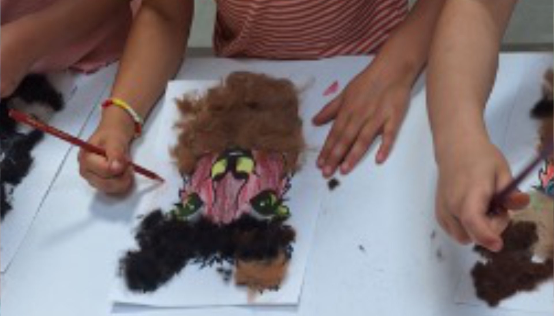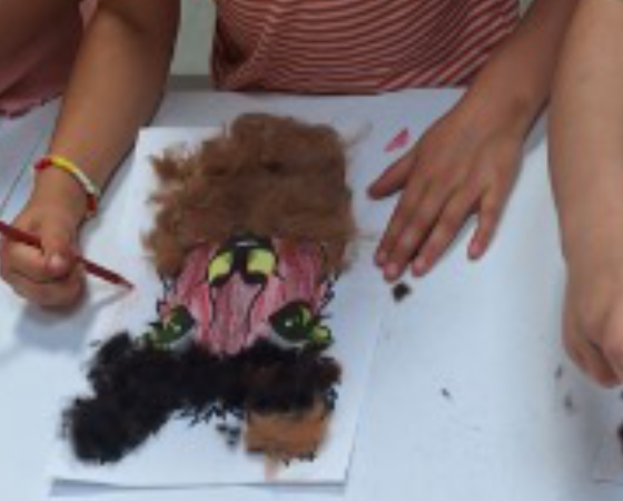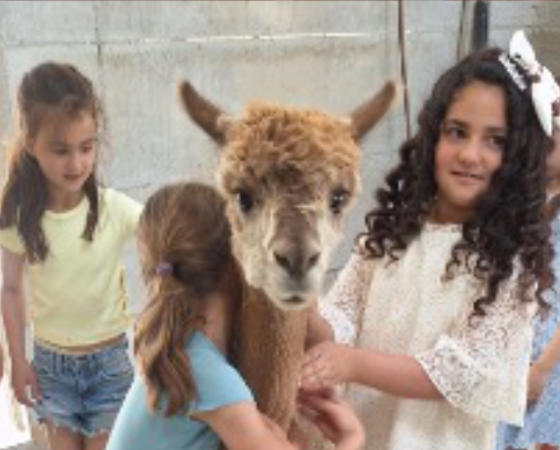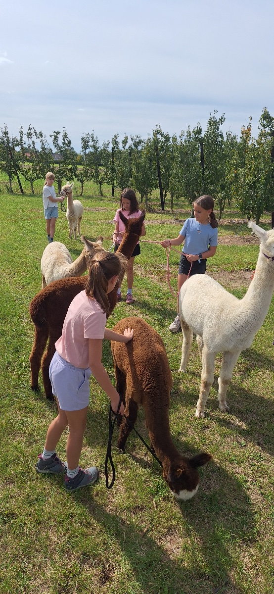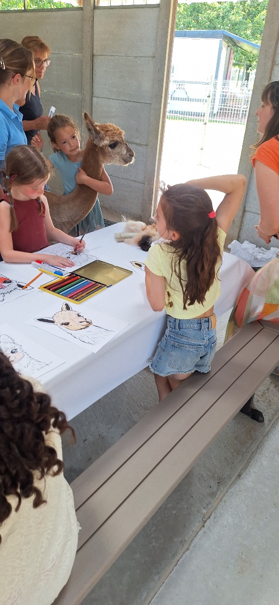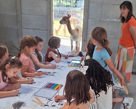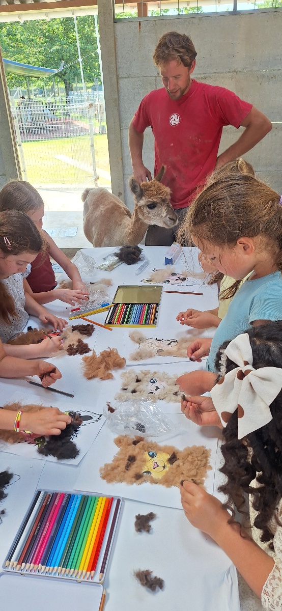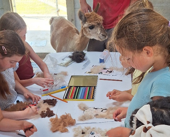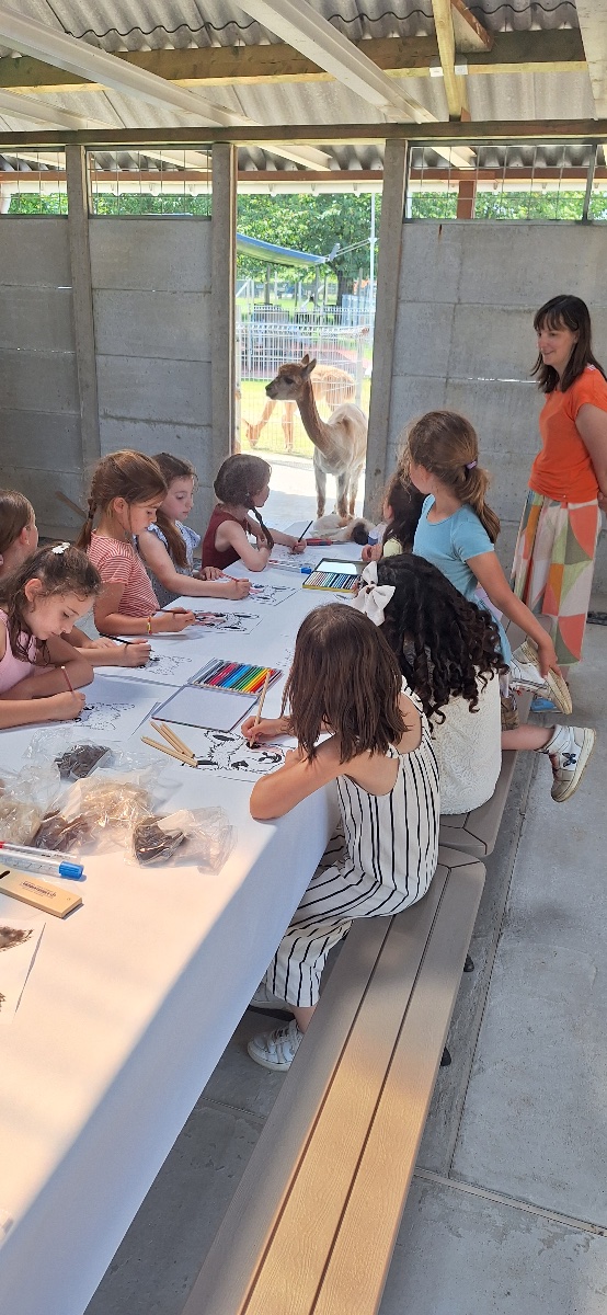 Tijdens het knutselen loopt er wel eens een alpaca tussen de tafels die een knuffel wil.